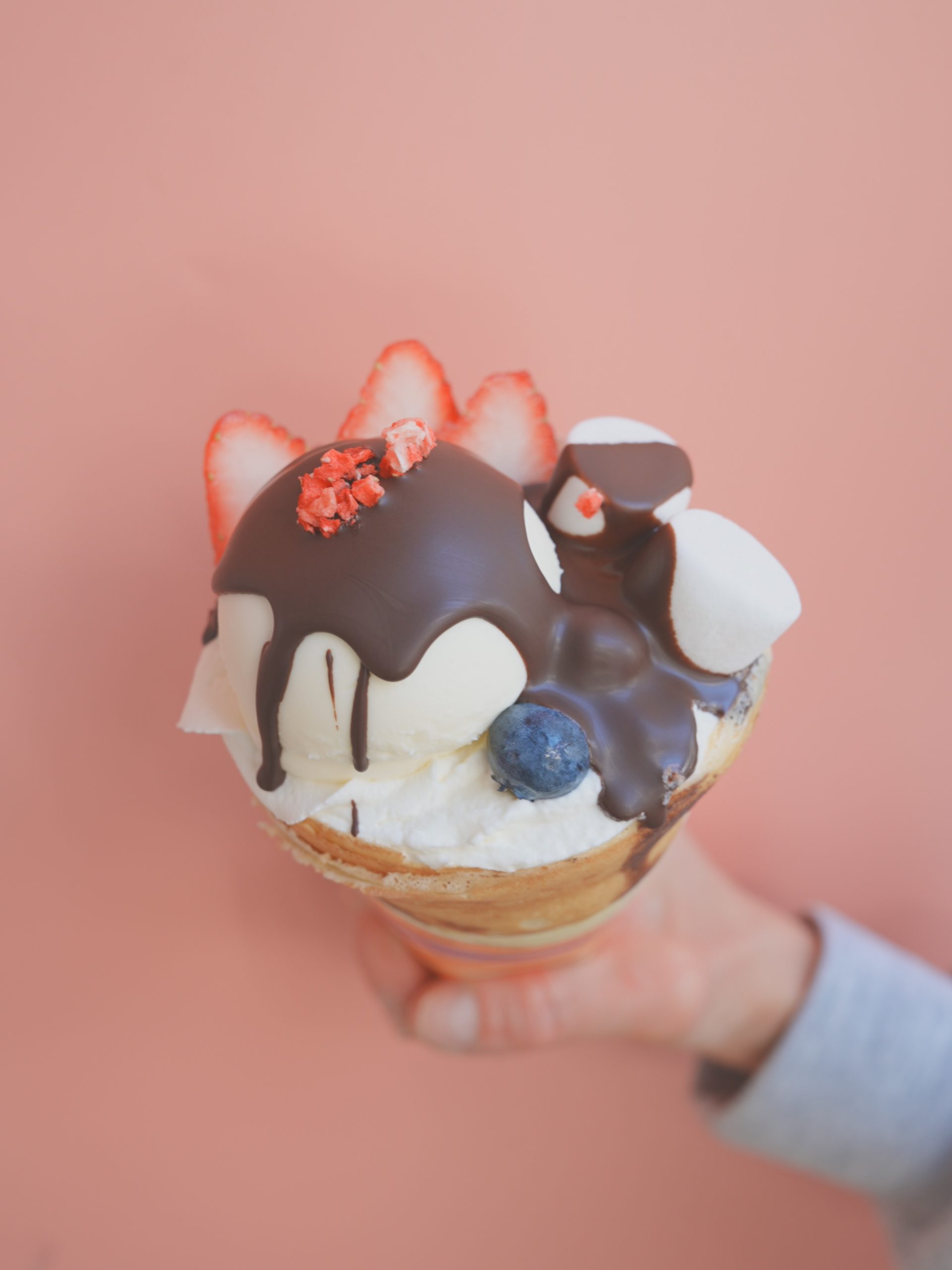 2月の限定は、この時期にぴったりのチョコレートを使ったクレープ!ホワイトチョコレアチーズとベリーを組み合わせて、さっぱりとした味わい。パリチョコ・マシュマロの食感も楽しめます。
